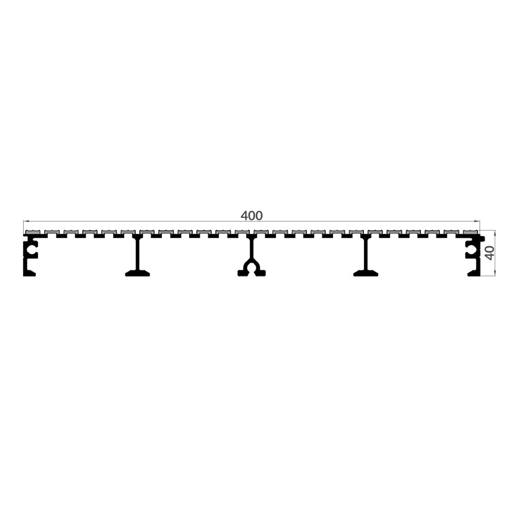 Plataforma de alumínio de 400×40 cuja face superior é fresada transversalmente para facilitar a aderência e a evacuação da água onde for necessário. Ideal para a montagem de todo o tipo de plataformas.