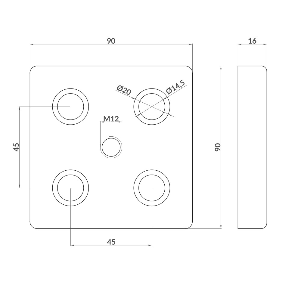 Placa base Aluskit® para perfil 90×90 roscada em M14 – preta