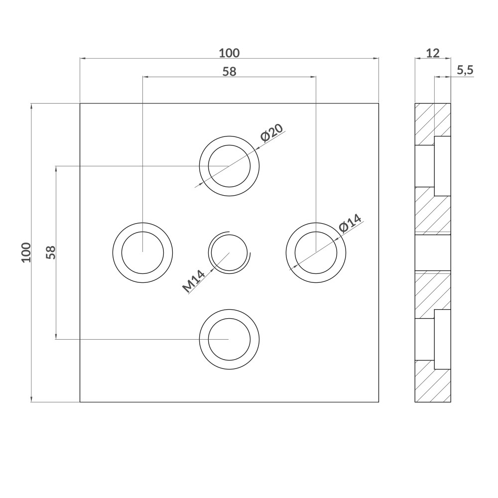 Placa base lisa de alumínio para o perfil Aluskit® de 100×100 que permite instalar de forma centrada um pé ou uma roda na base do mesmo.