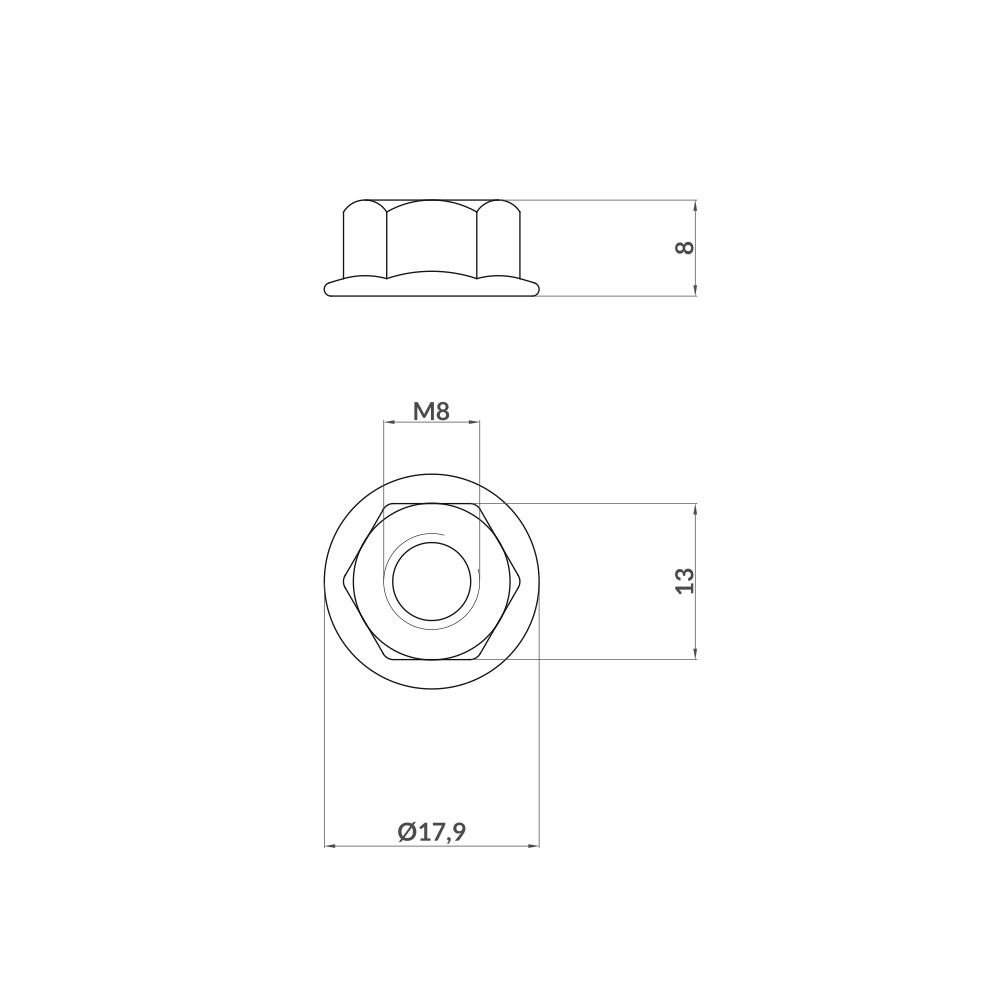 Porca com flange grafitada M8 em aço inoxidável, compatível com montagens em qualquer ambiente.