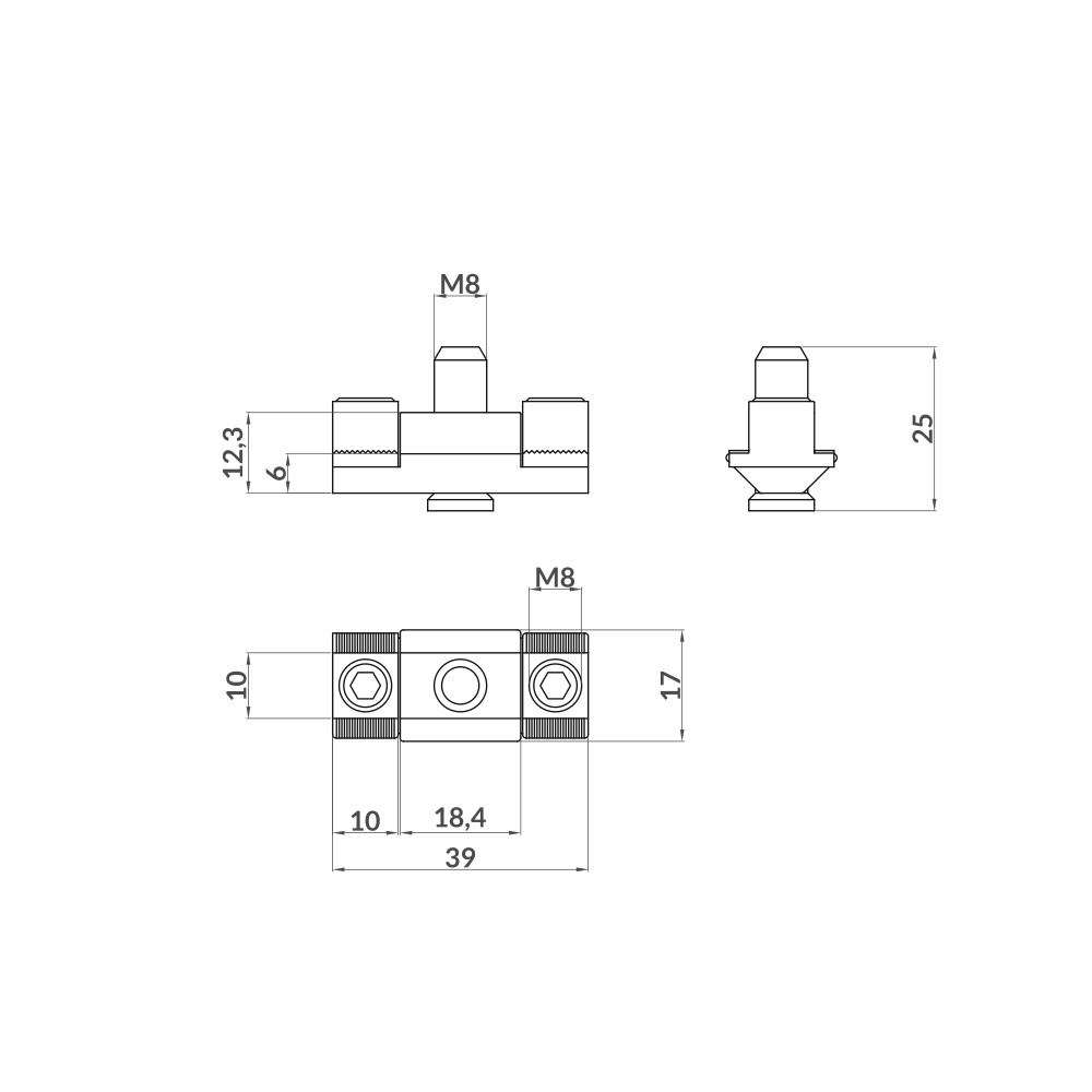 União interna compatível com perfis modulares de alumínio Aluskit de 40×40, fixada por rosca na nervura central para instalar a peça base e, posteriormente, uma vez deslizado o perfil para a sua posição, apertando os parafusos correspondentes.