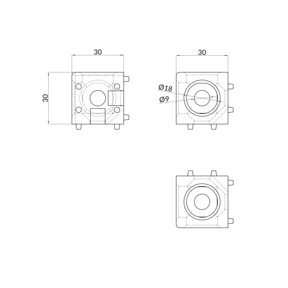 Cubo de montagem para fazer cantos a 90º entre três perfis modulares de alumínio do Sistema Aluskit® de 30×30. Não inclui o parafuso de montagem auto-roscante necessário para a sua montagem.