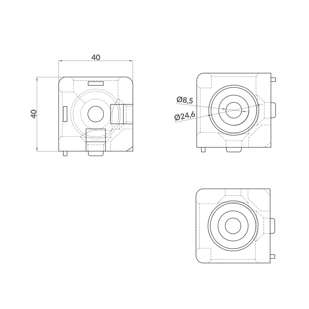 Cubo de montagem para realizar cantos a 90º entre três perfis modulares de alumínio do Sistema Aluskit® de 40×40. Não inclui o parafuso de montagem auto-roscante necessário para a sua montagem.