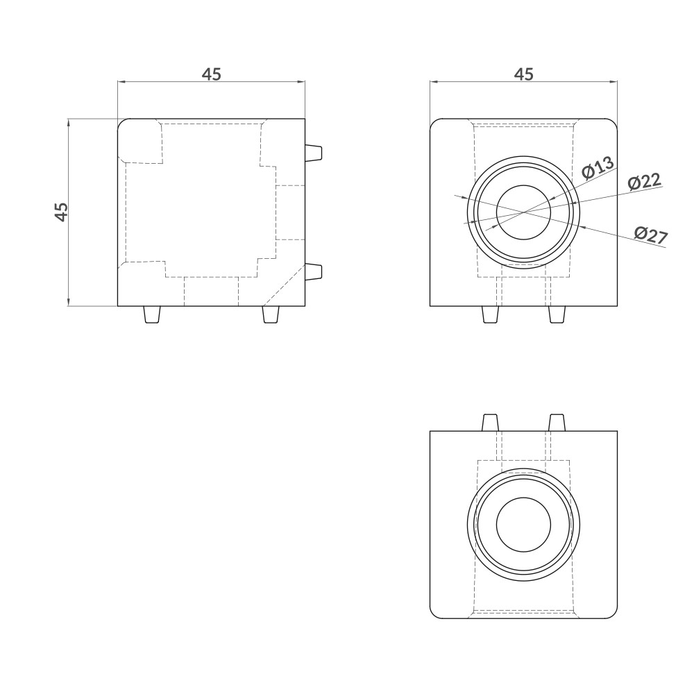 Cubo de montagem para realizar cantos a 90º entre dois perfis modulares de alumínio do Sistema Aluskit® de 45×45. Não inclui o parafuso de montagem auto-roscante necessário para a sua montagem.