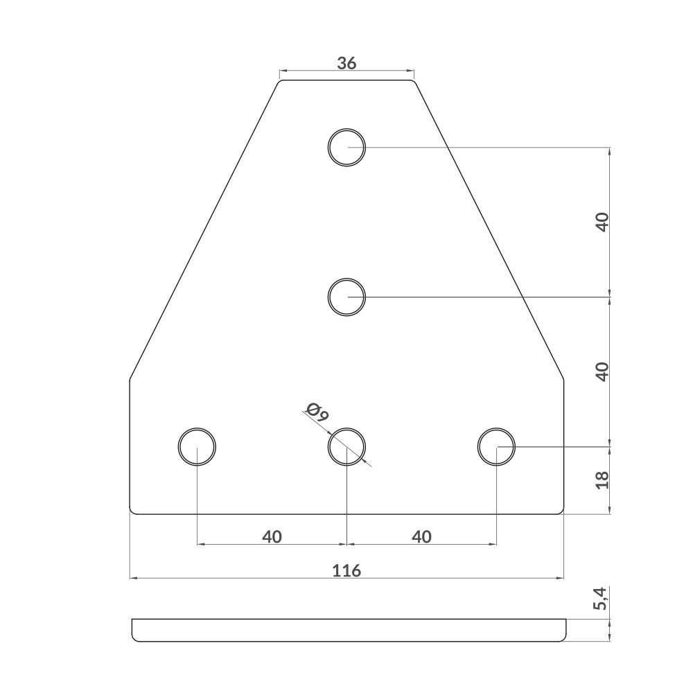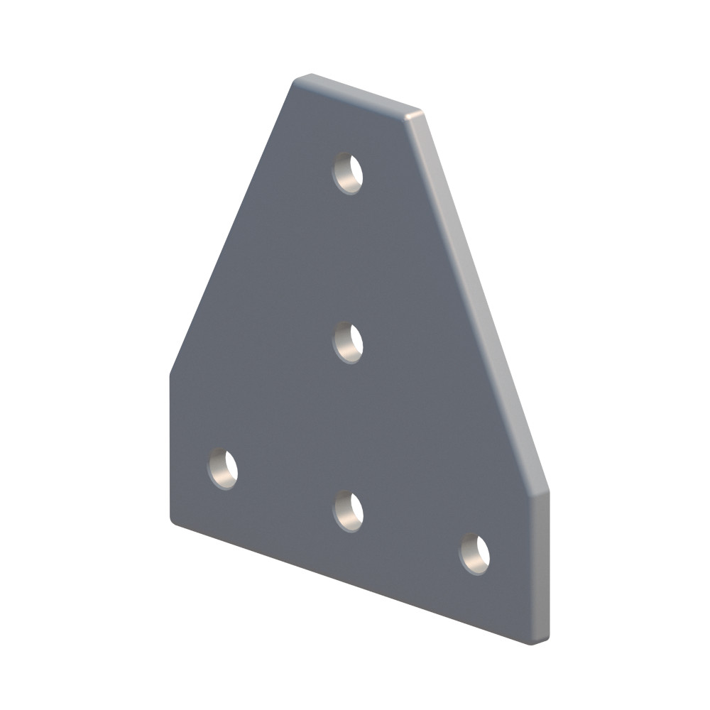 Placa de conexão externa para uniões transversais a 90º de perfis modulares de alumínio da Série 40. Não inclui parafusos, que devem ser selecionados de acordo com a montagem a ser realizada.