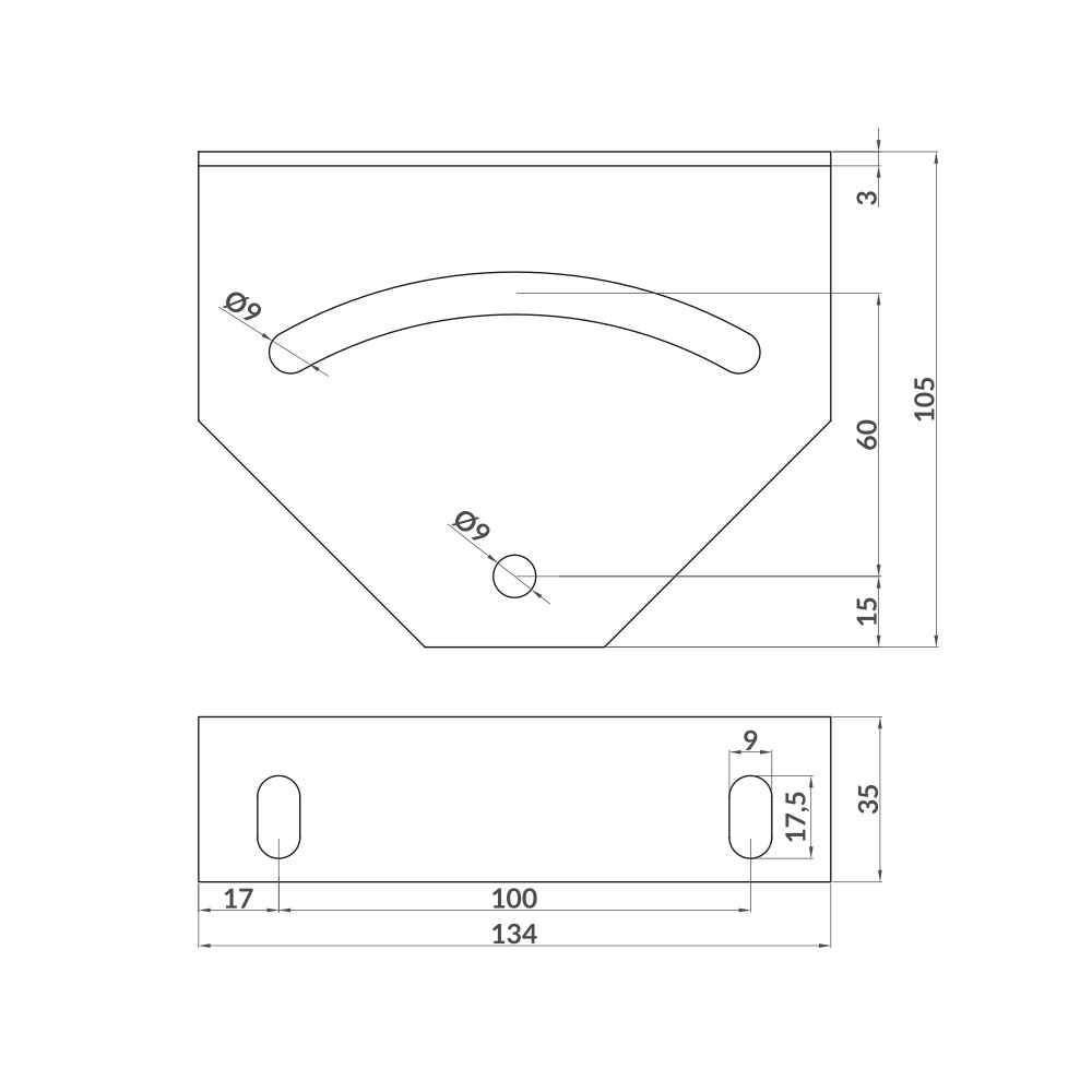Placa para realizar ligações giratórias reguláveis entre dois perfis ou entre um perfil e um painel, de forma transversal. Não inclui parafusos.