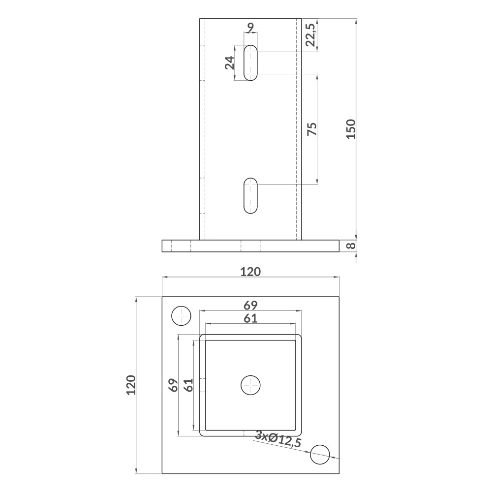 Suporte tubular para fixar perfis de 60×60 à superfície.