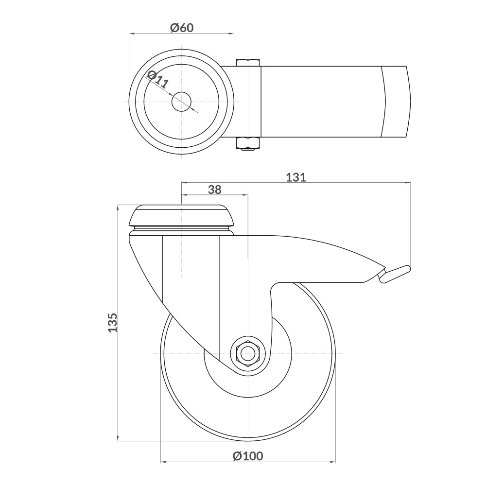 Início > Produtos > Sistema Aluskit® > Acessórios Aluskit® > Roda de borracha cinzenta Ø100×32 giratória com travão S30/40