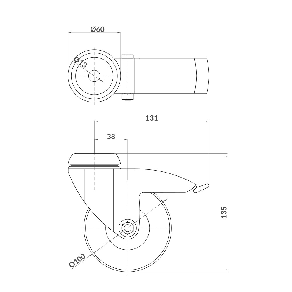 Início > Produtos > Sistema Aluskit® > Acessórios Aluskit® > Roda com pneu cinzento Ø100×32 giratória com travão S45