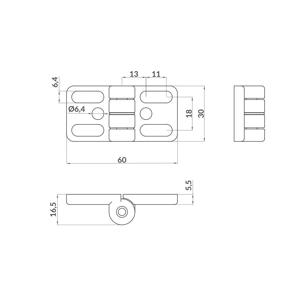 Dobradiça em zamak para a união giratória de dois perfis. Permite tanto a união em paralelo como na secção dos perfis de 30×30. Não inclui parafusos.