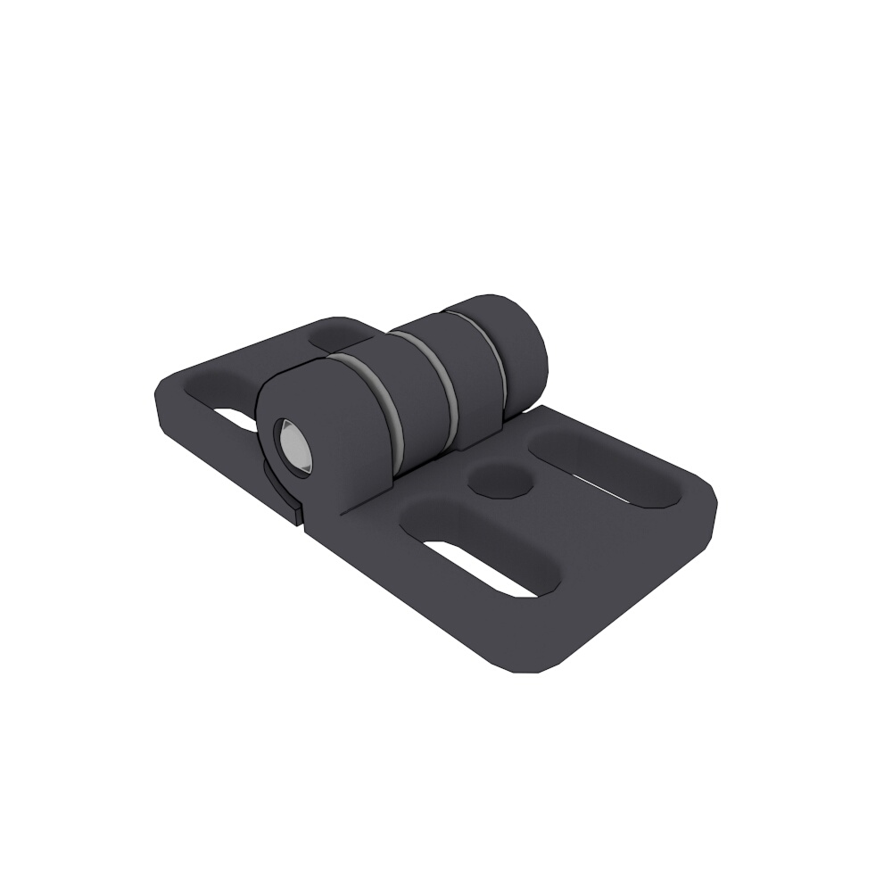Dobradiça em zamak para a união giratória de dois perfis. Permite tanto a união em paralelo como na secção dos perfis de 40×440. Não inclui parafusos.