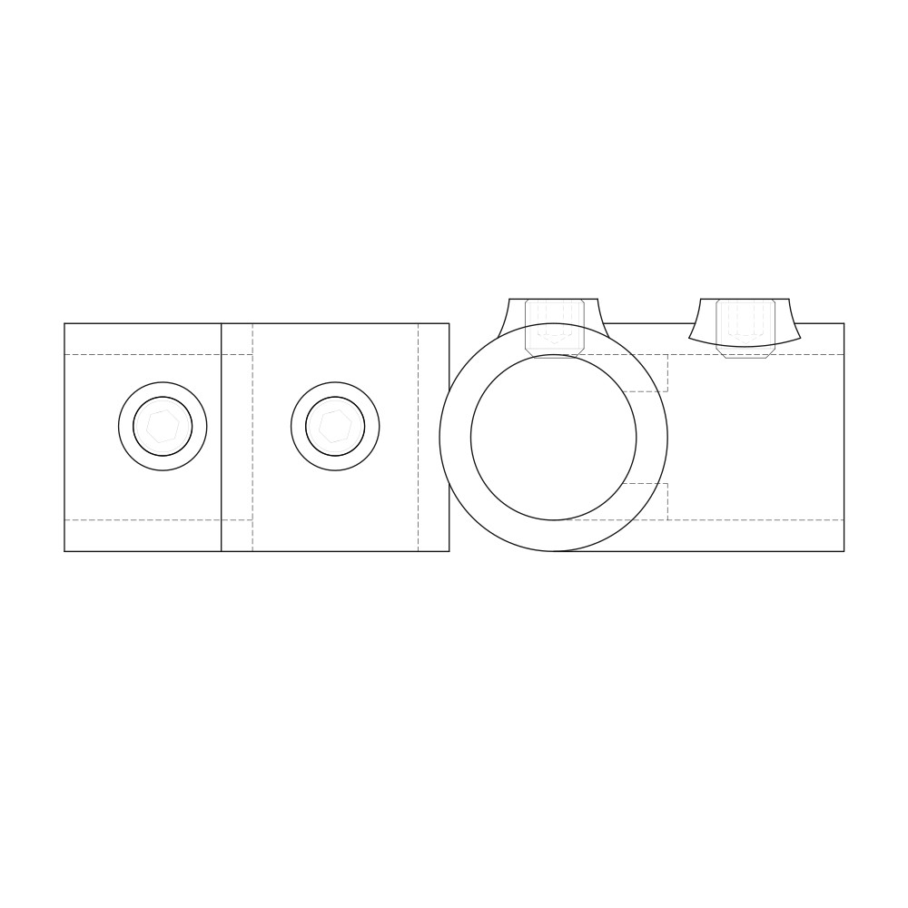 União para unir dois tubos passantes em cruz a outros dois tubos terminais a 90º de ambos. Os tubos são fixados através da pressão dos parafusos prisioneiros.