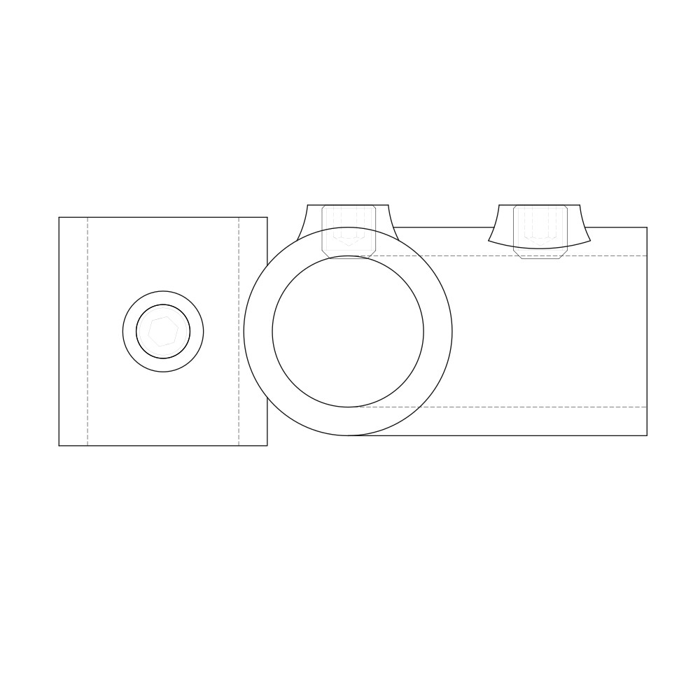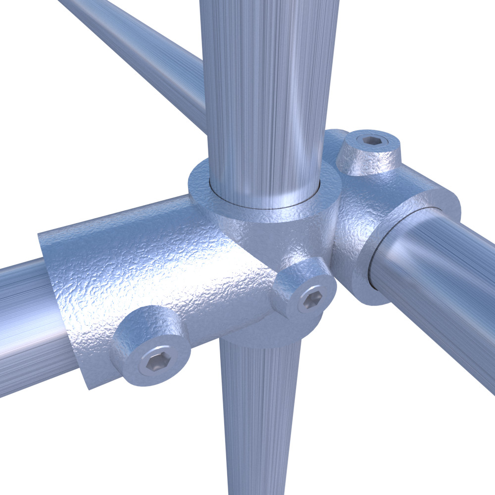 União para unir dois tubos passantes em cruz a outro terminal a 90º de ambos. Os tubos são fixados através da pressão dos parafusos prisioneiros.