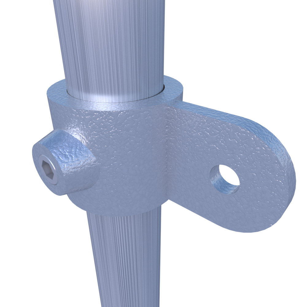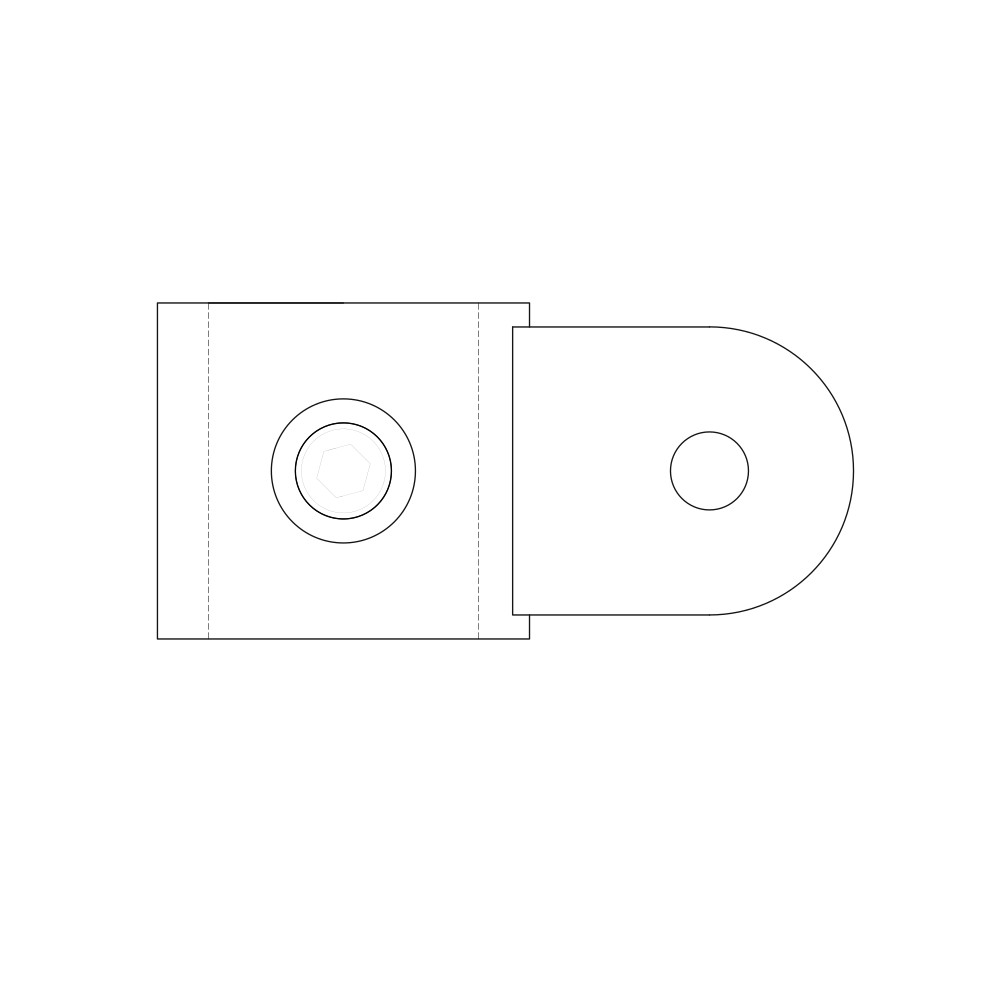União passante com uma patilha para, em conjunto com outros Uniãoes, realizar uniões de Cantoneira variável ou para instalar painéis. O tubo é fixado através da pressão do parafuso prisioneiro.