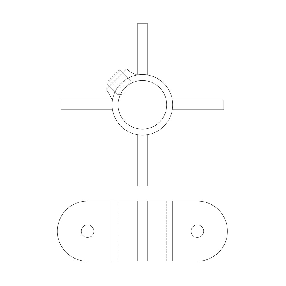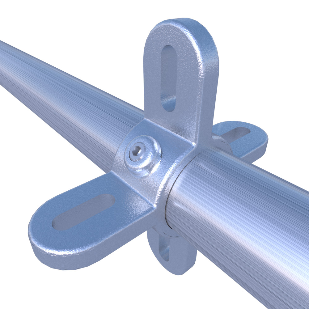 União passante com quatro patilhas a 90º para, em conjunto com outros Uniãoes, realizar uniões de Cantoneira variável ou para instalar painéis. O tubo é fixado por pressão do parafuso prisioneiro.