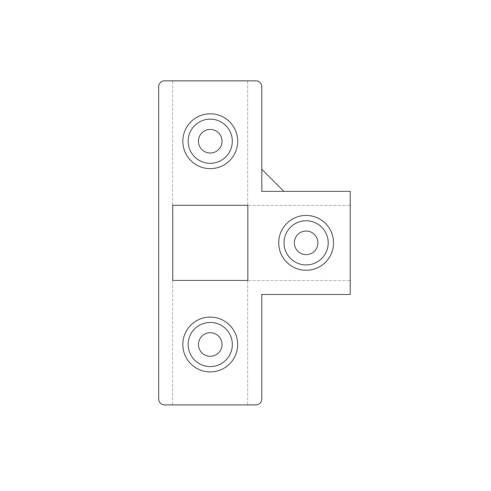 União para unir três tubos quadrados terminais a 90º com outro passante. Os tubos são fixados através da pressão dos parafusos prisioneiros.