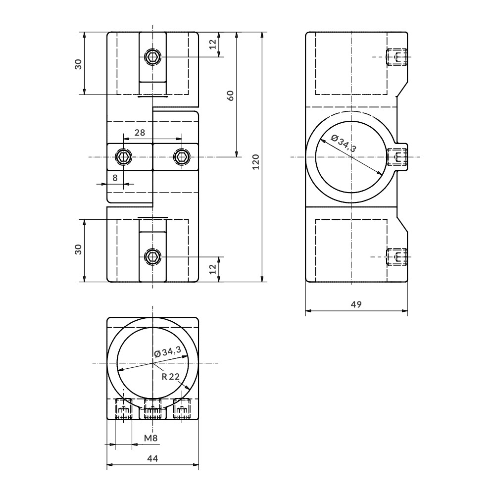 União para conectar 4 tubos terminais, dois deles longitudinalmente e os outros dois com um Cantoneira variável. Fixam-se através da pressão exercida por parafusos prisioneiros. Não requer usinagem dos tubos.