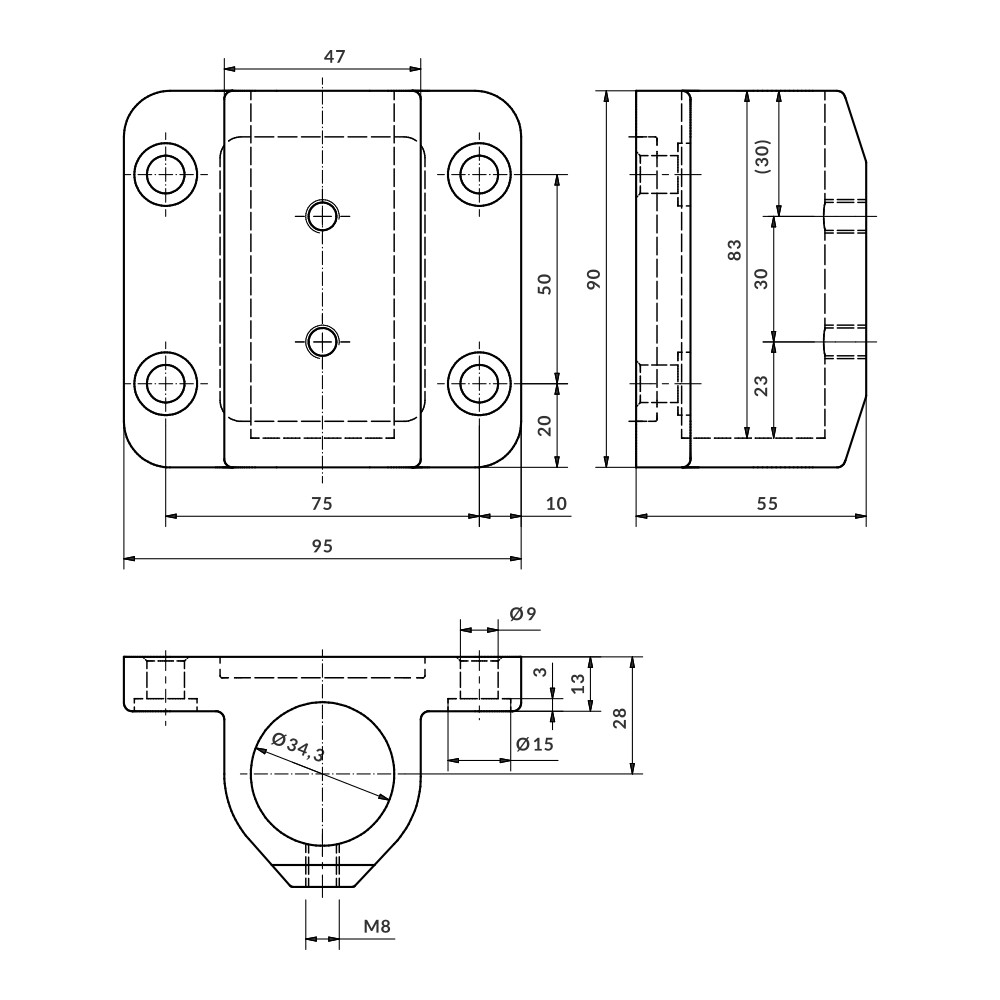 Conetor base suporte lateral parafusos prisioneiros Ø33,7