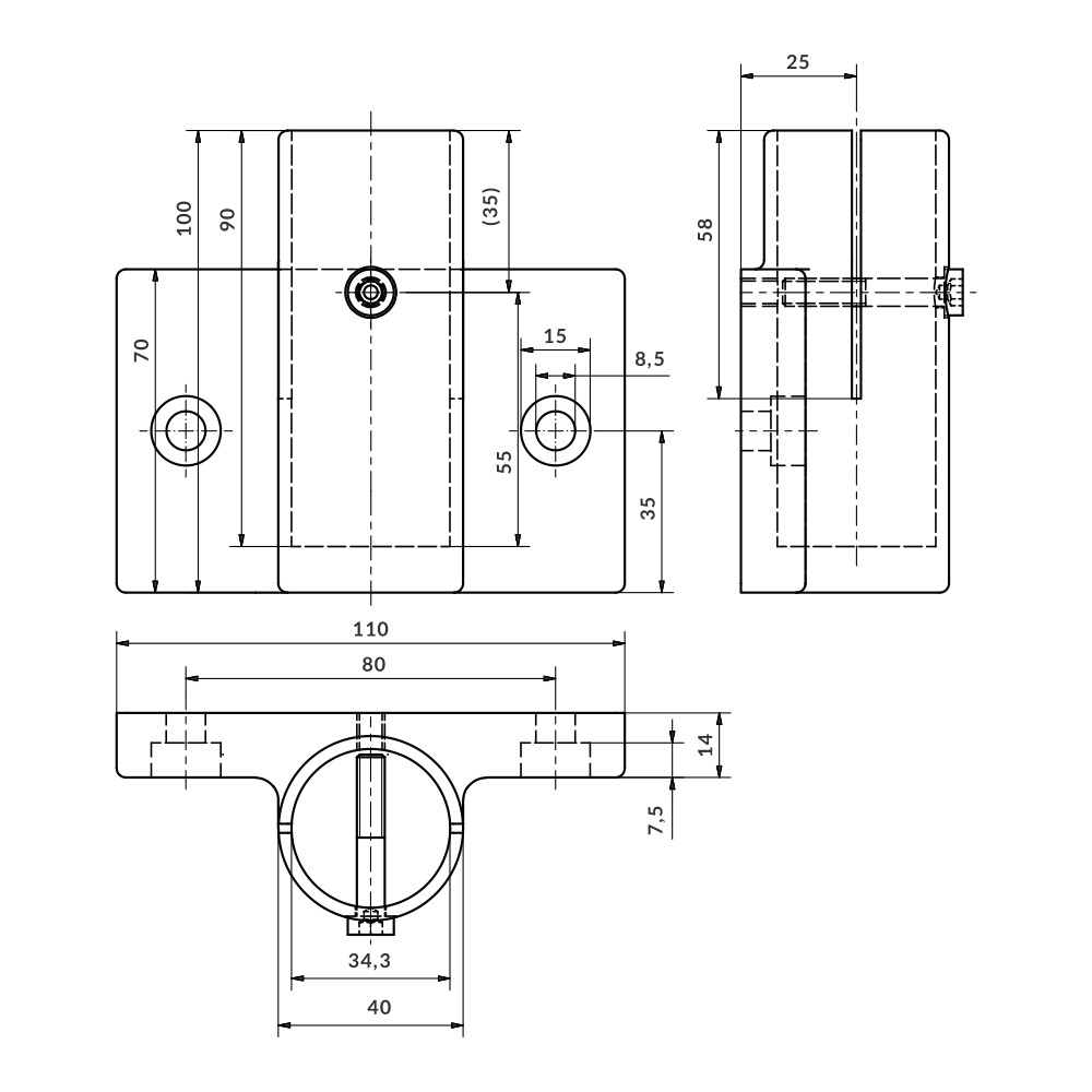 Base de fixação para suporte de um tubo terminal numa superfície vertical. O tubo é unido através da pressão das duas partes do União. É necessário perfurar a extremidade dos tubos para a inserção dos parafusos.
