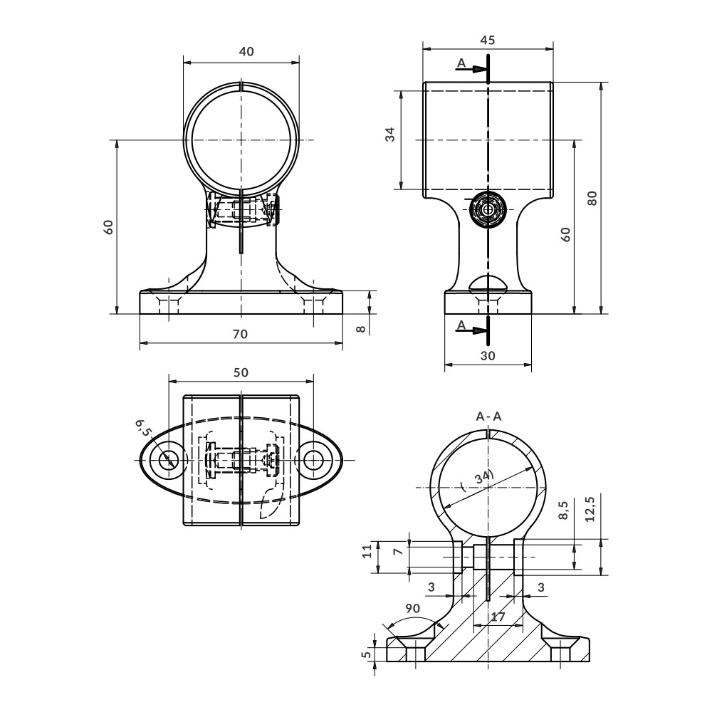 União para fixação passante de um tubo paralelo à superfície. É unido por pressão das duas partes do União. Não requer usinagem dos tubos.