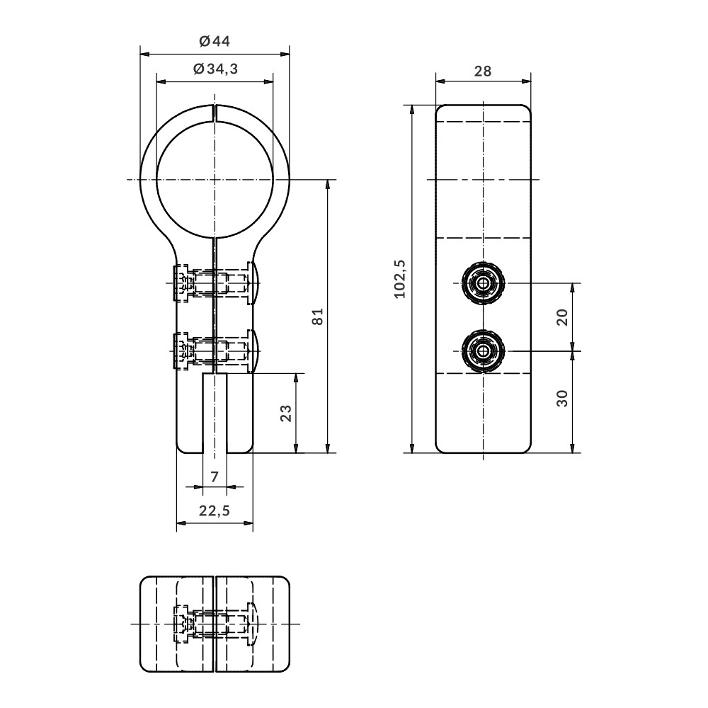 União para fixação lateral de painéis. É unido por pressão das duas partes do União. Não requer usinagem dos tubos.