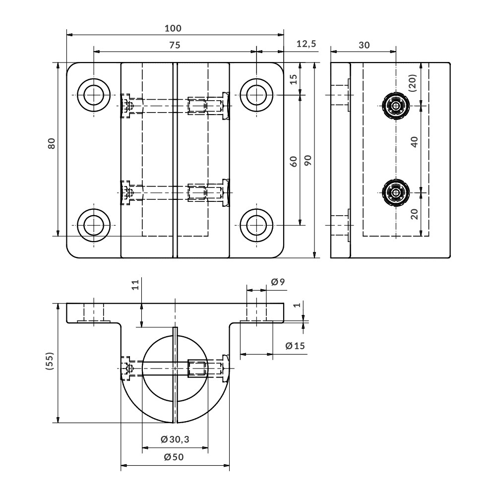 Conetor base suporte lateral abertura frontal H80 Ø30