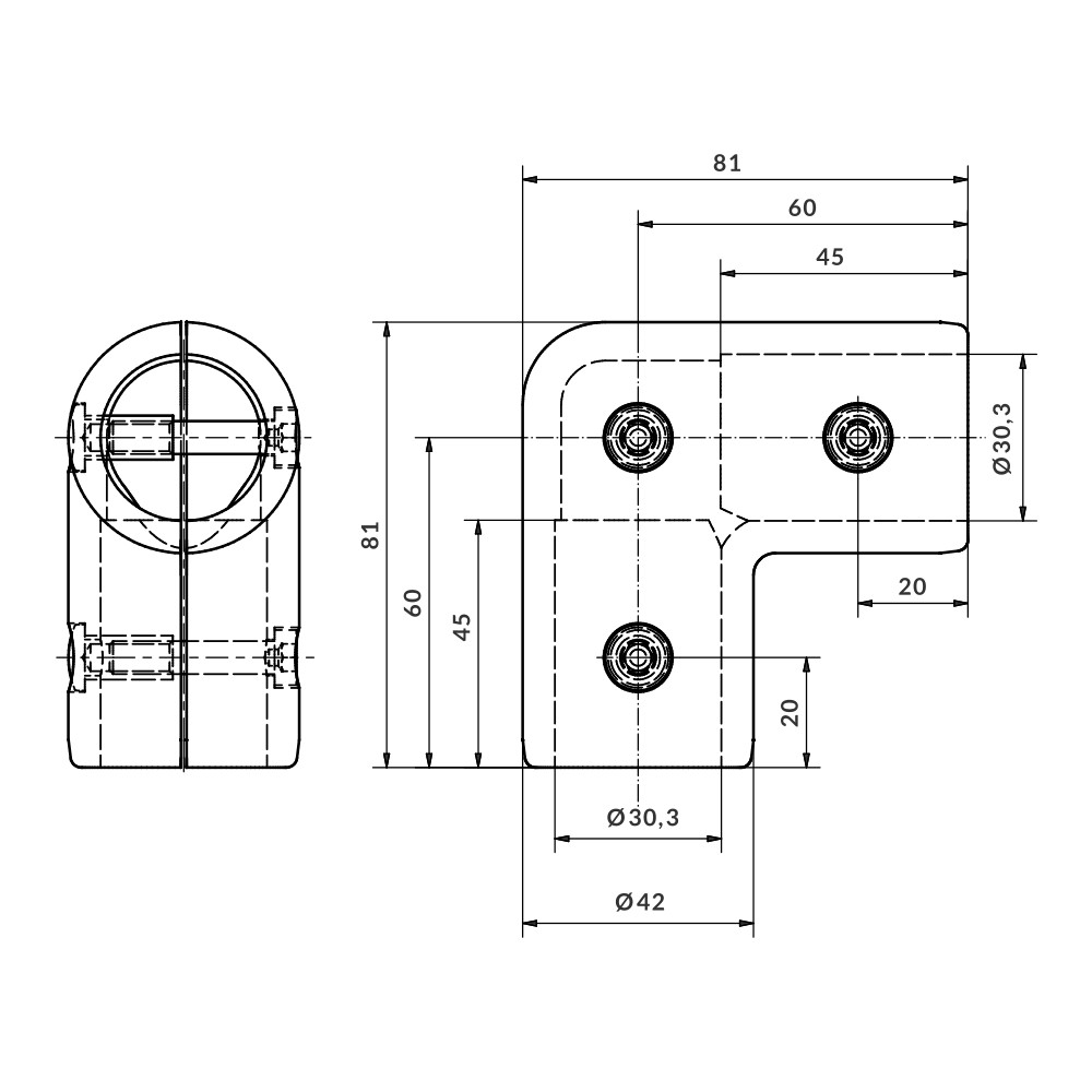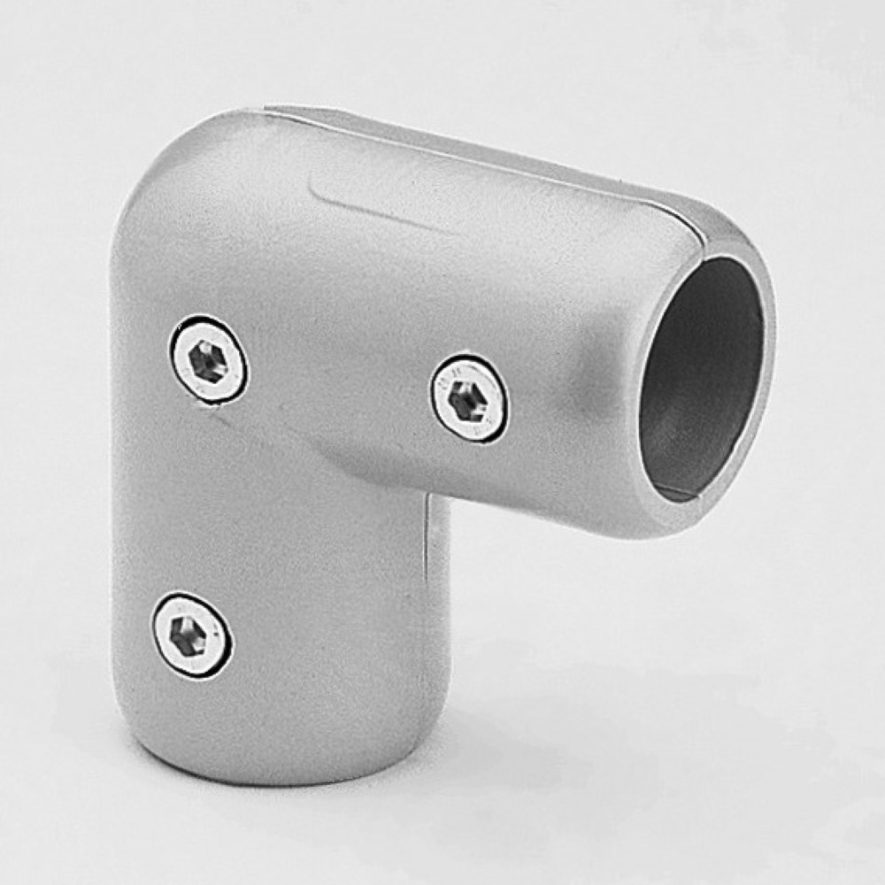 União Curva para unir dois tubos terminais a 90º. São unidos através da pressão das duas partes do União. Requer perfuração dos tubos para a inserção dos parafusos. Proporciona uma união robusta.
