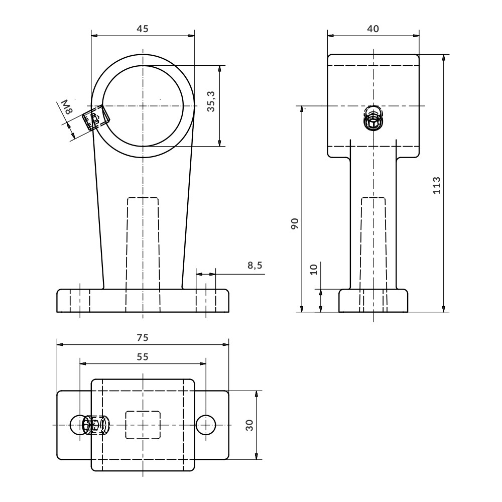 União para fixação passante de um tubo paralelo à superfície. É unido por pressão do parafuso prisioneiro. Não requer usinagem dos tubos.