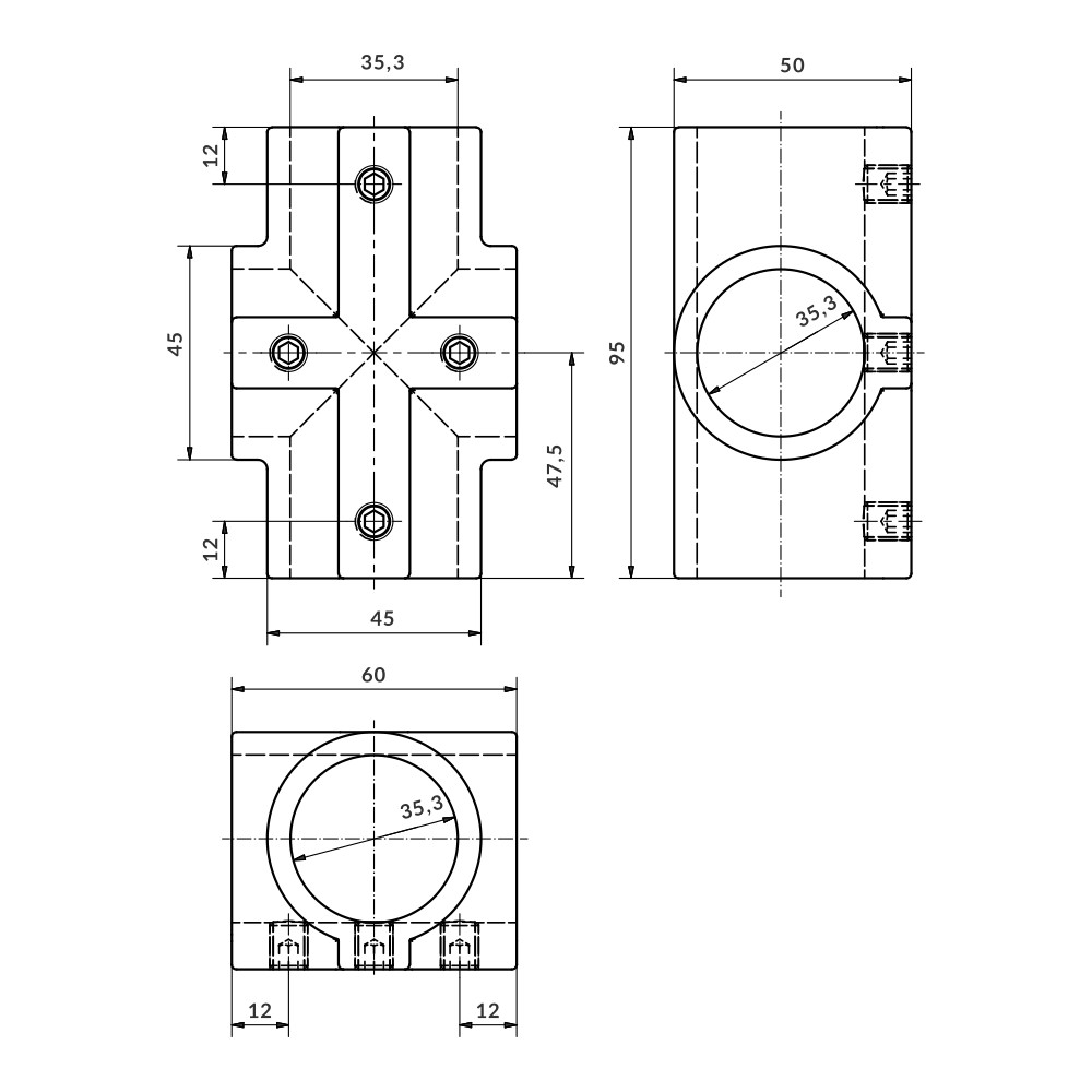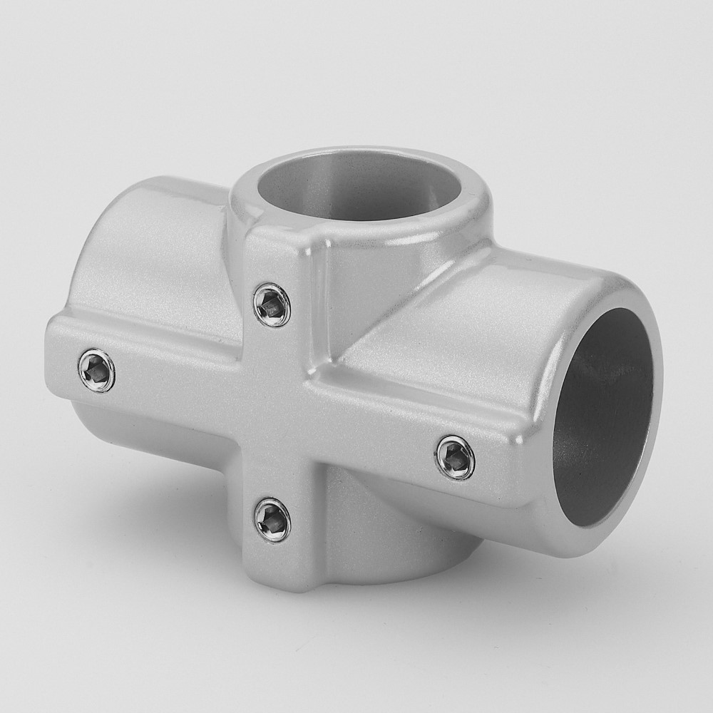 União para conectar um tubo passante a outros dois tubos terminais a 90º. São fixados através da pressão exercida por parafusos prisioneiros. Não requer usinagem dos tubos.