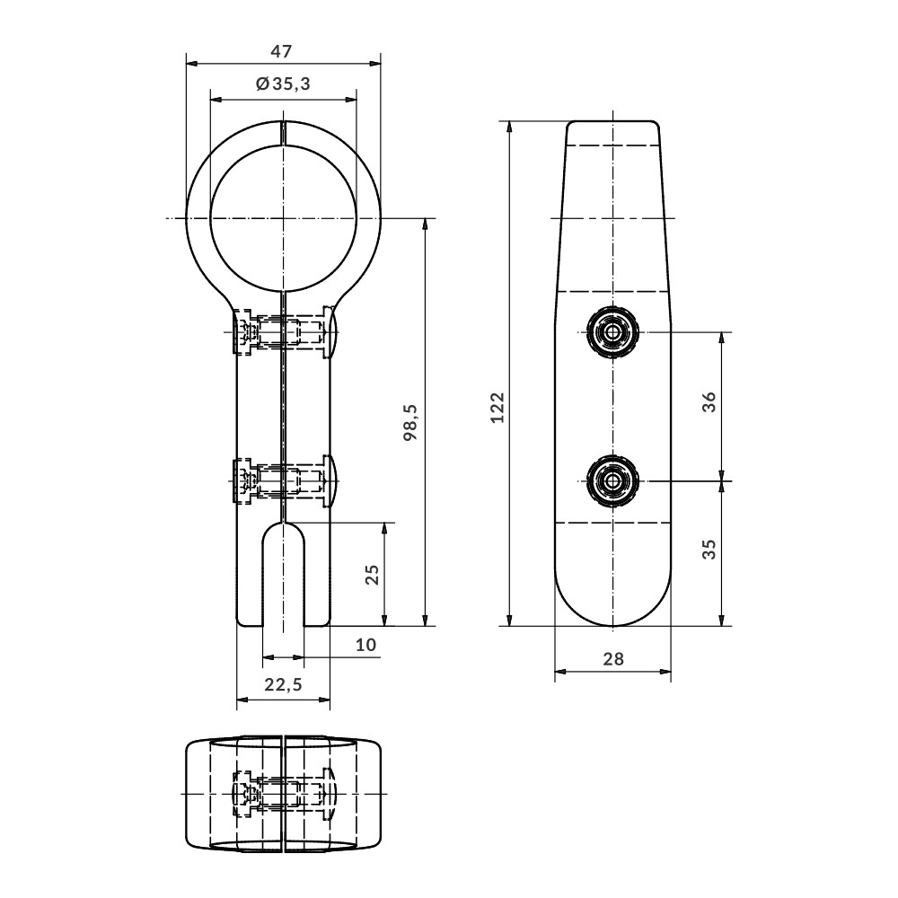 União para fixação lateral de painéis. É unido por pressão das duas partes do União. Não requer usinagem dos tubos.