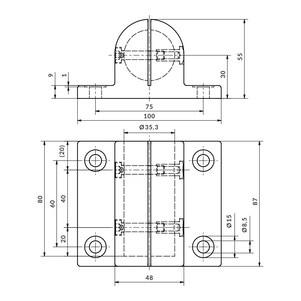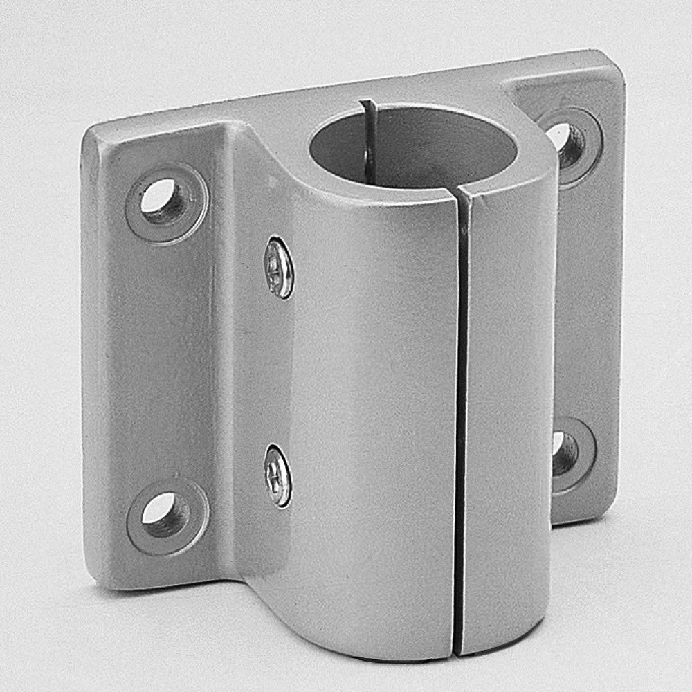 Base de fixação para suporte de um tubo passante numa superfície vertical. O tubo é unido através da pressão das duas partes do União. É necessário perfurar o tubo para a inserção dos parafusos. Proporciona uma união robusta.