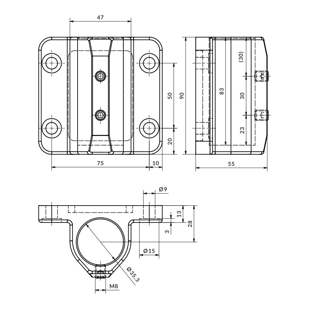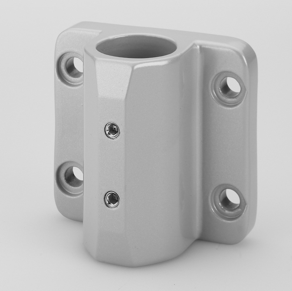 Base de fixação para suporte de um tubo terminal numa superfície vertical. O tubo é fixado através da pressão exercida pelos parafusos prisioneiros. Não requer usinagem dos tubos.