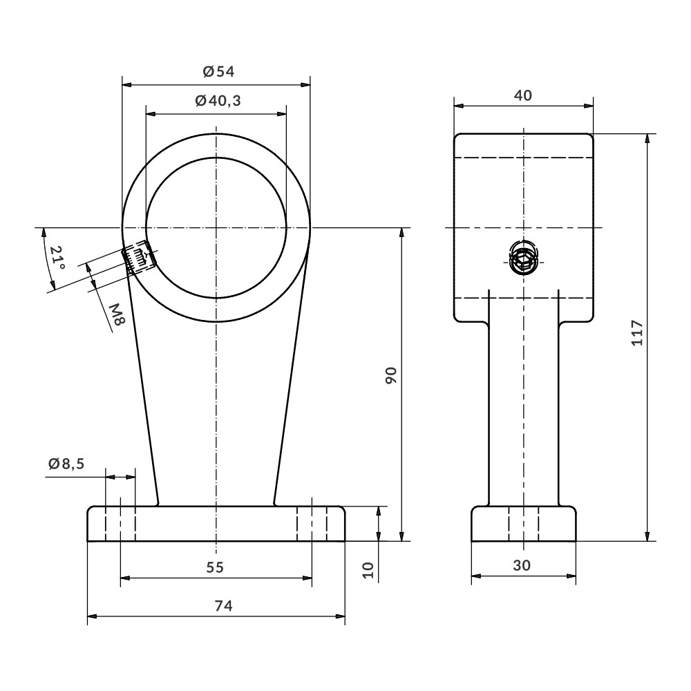União para fixação passante de um tubo paralelo à superfície. É unido por pressão do parafuso prisioneiro. Não requer usinagem dos tubos.