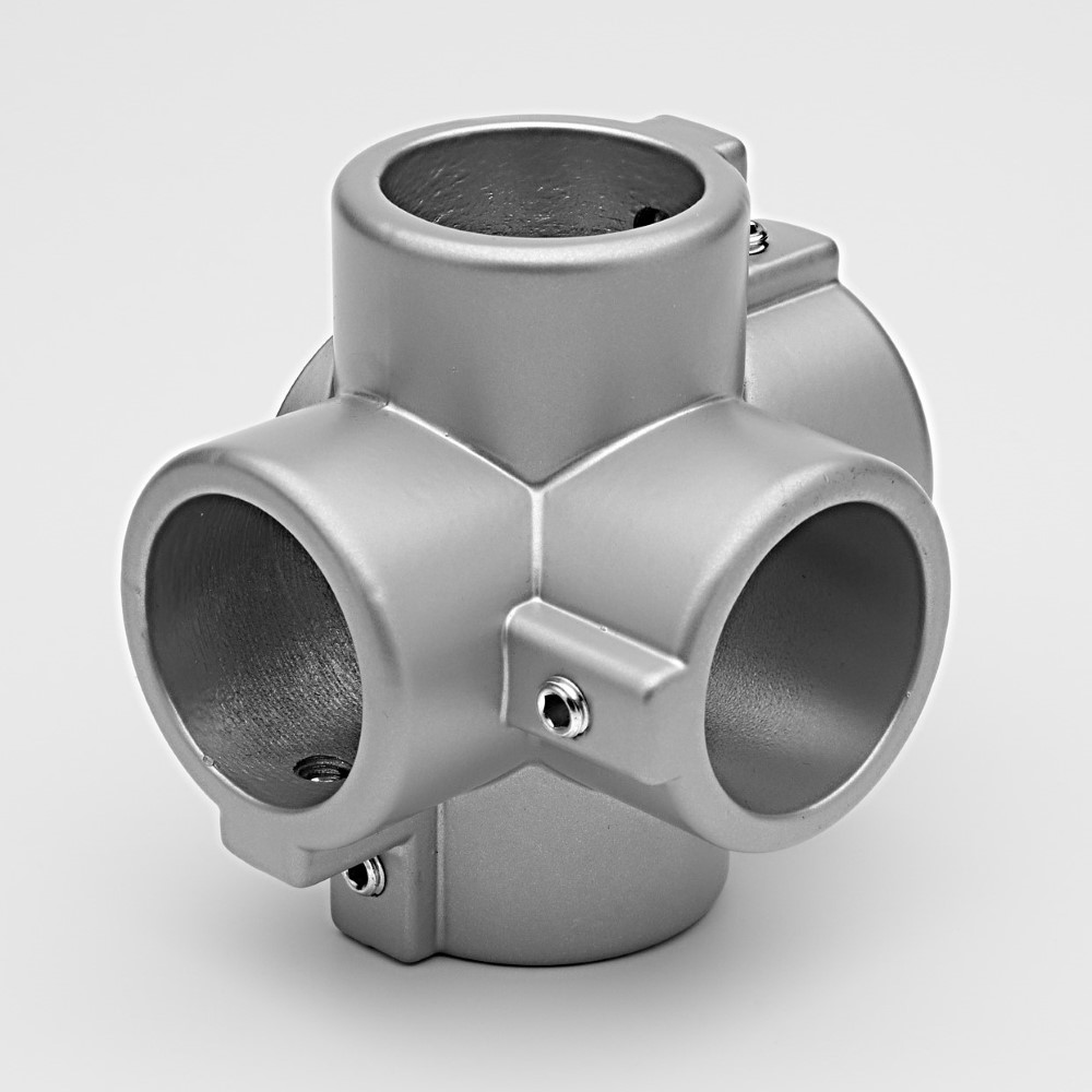 União para unir vários tubos com 6 saídas a 90º entre si. Os tubos são fixados através da pressão exercida pelos parafusos prisioneiros. Não requer usinagem dos tubos.