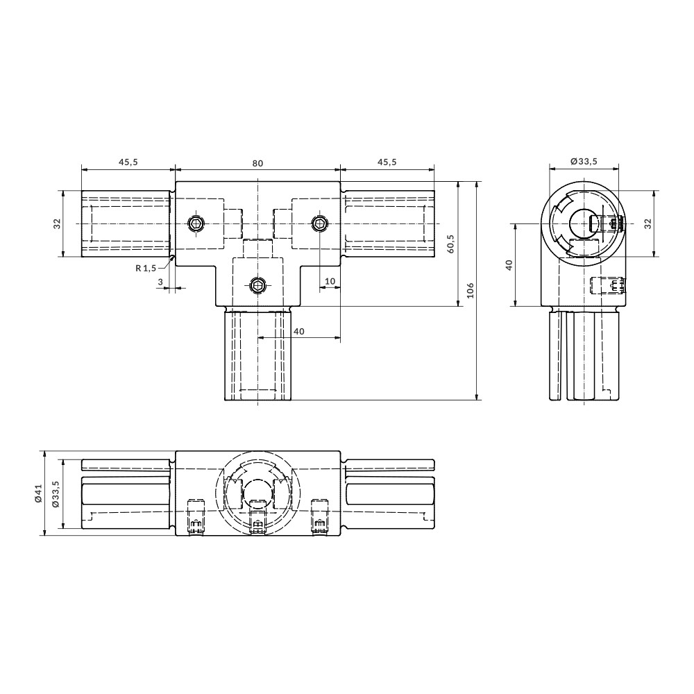 União para união em T a 90º de três tubos terminais Ø40×3. Estes Uniãoes ficam praticamente nivelados com o tubo. A fixação dos mesmos é feita através da pressão das abas internas com aperto por meio de parafusos prisioneiros. Não requer usinagem dos tubos.