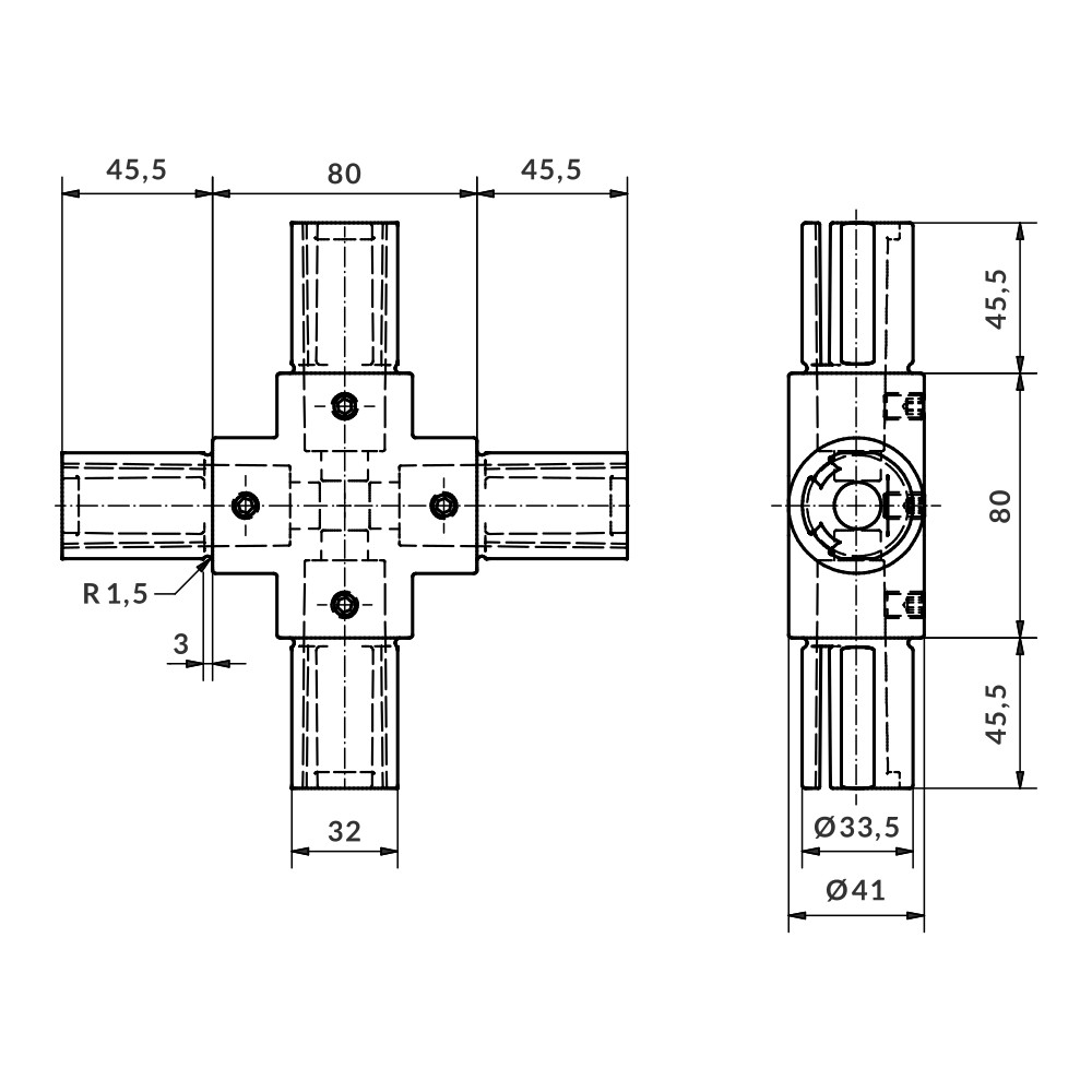 União para união em cruz de 90º de quatro tubos de Ø40×3 terminais. Estes Uniãoes ficam praticamente nivelados com o tubo. A fixação dos mesmos é feita através da pressão das abas internas com aperto por meio de parafusos prisioneiros. Não requer usinagem dos tubos.