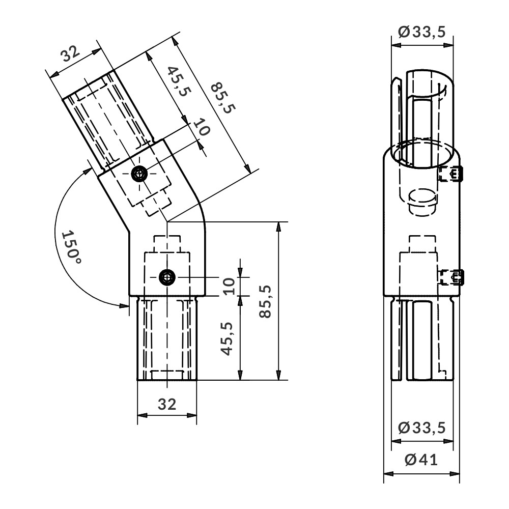 União para união a 30-150º de dois tubos de Ø40×3 terminais. Estes Uniãoes ficam praticamente nivelados com o tubo. A fixação dos mesmos é feita por pressão das abas internas com aperto por meio de parafusos prisioneiros. Não requer usinagem dos tubos.