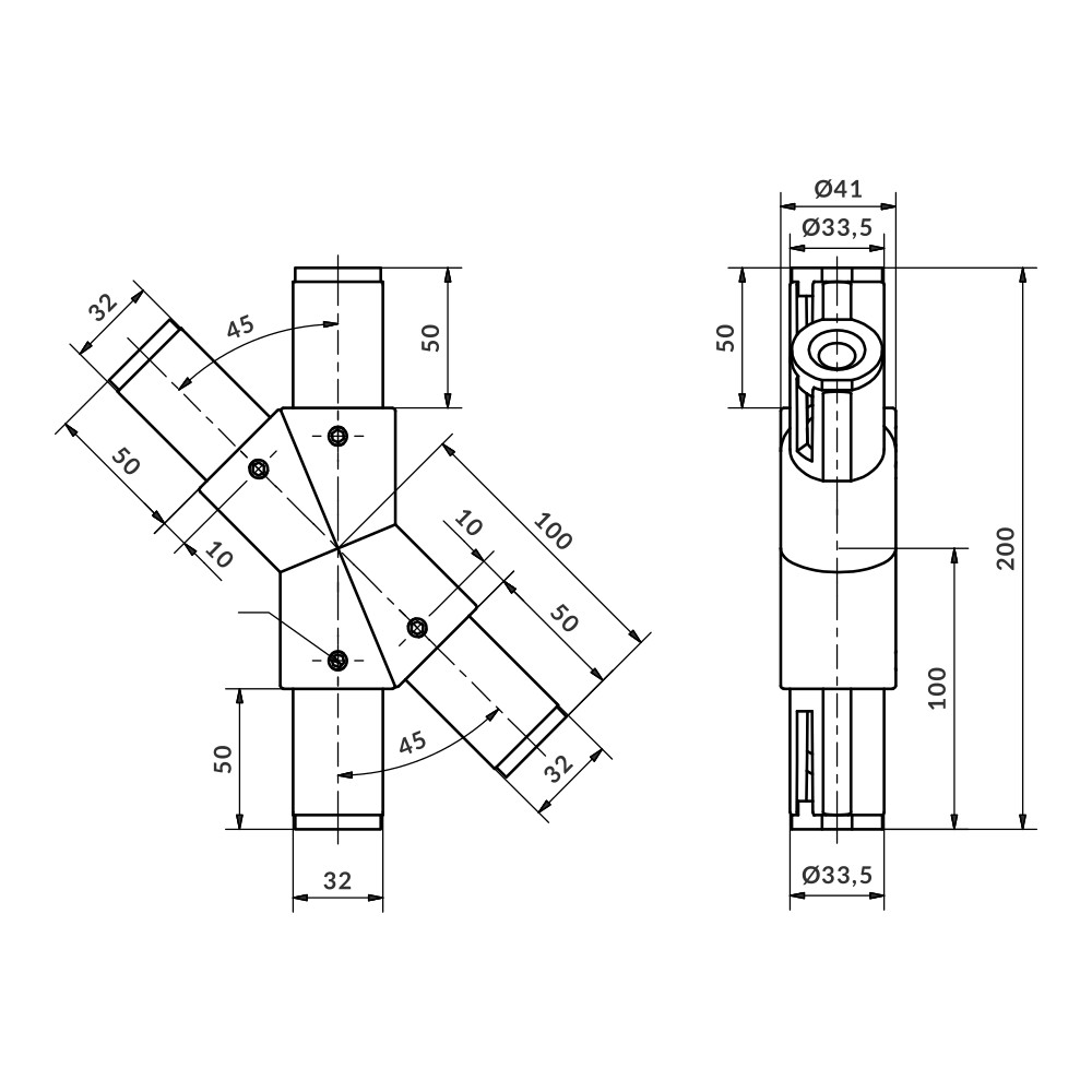 União para união em cruz a 45-135º de quatro tubos de Ø40×3 terminais. Estes Uniãoes ficam praticamente nivelados com o tubo. A fixação dos mesmos é feita por pressão das abas internas com aperto por meio de parafusos prisioneiros. Não requer usinagem dos tubos.