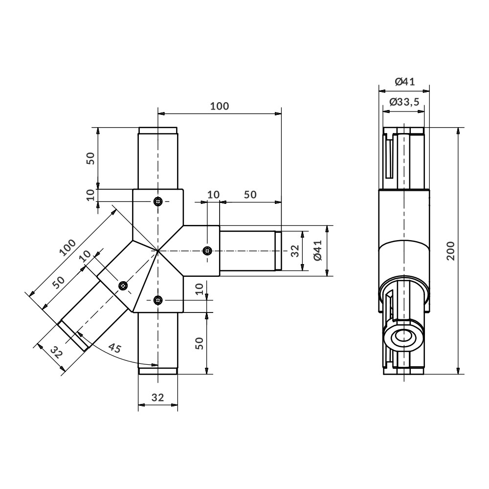 União para união em cruz a 45-135º e 90º de quatro tubos de Ø40×3 terminais. Estes Uniãoes ficam praticamente nivelados com o tubo. A fixação dos mesmos é feita através da pressão das abas internas com aperto por meio de parafusos prisioneiros. Não requer usinagem dos tubos.