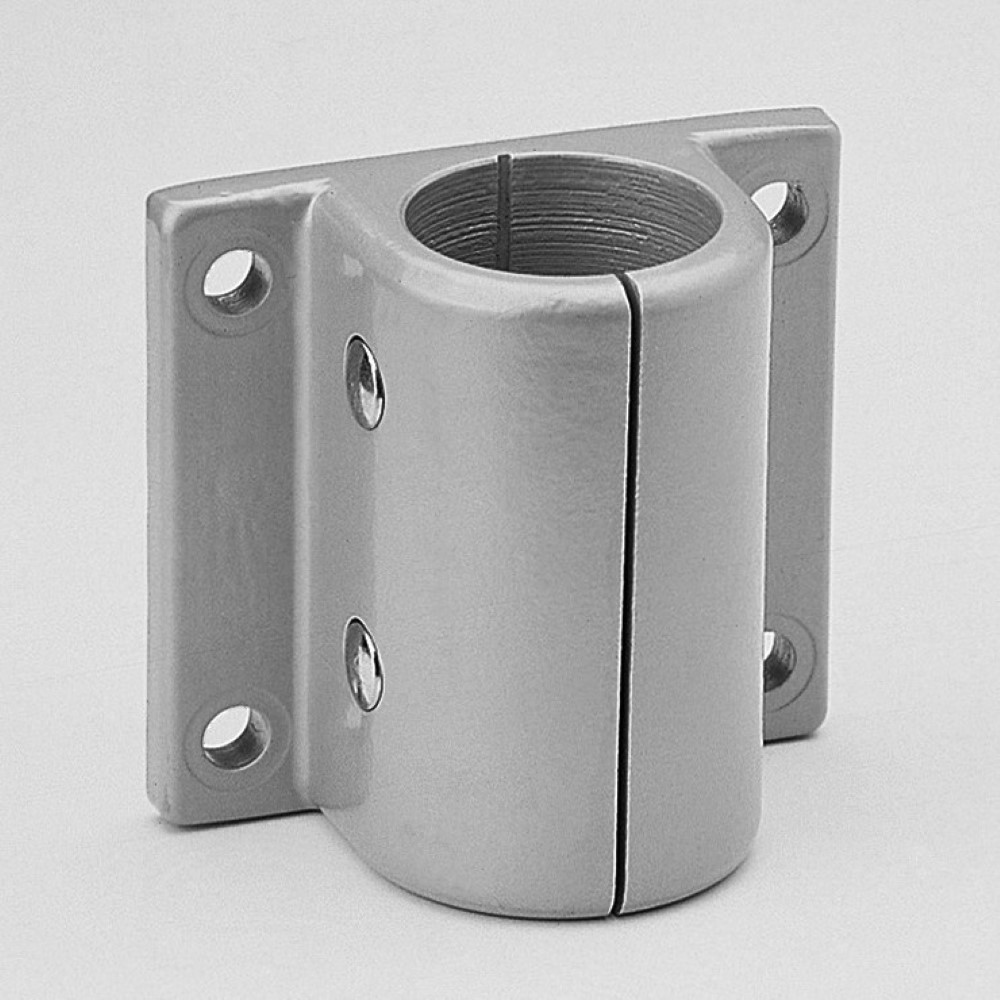 Base de fixação para suporte de um tubo passante numa superfície vertical. O tubo é unido através da pressão das duas partes do União. É necessário perfurar o tubo para a inserção dos parafusos. Proporciona uma união robusta.