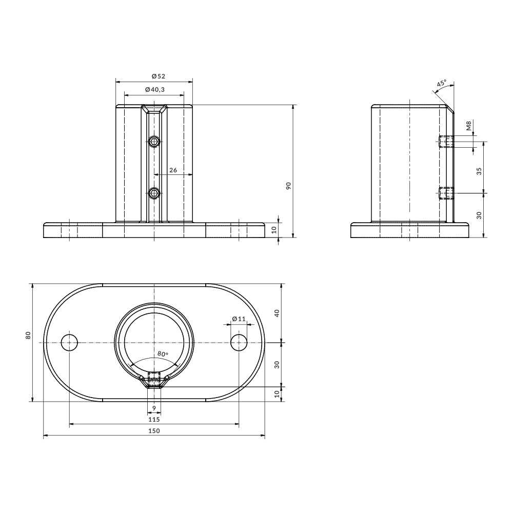 Base de fixação para fixação do tubo à superfície, com 2 pontos de fixação. O tubo é fixado através da pressão exercida pelos parafusos prisioneiros. Não requer usinagem dos tubos.