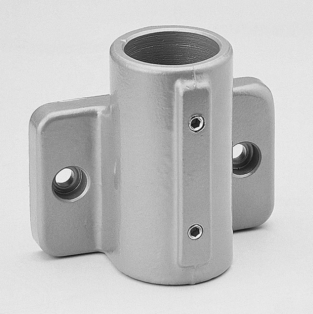 Base de fixação para ancoragem numa superfície num Cantoneira de 90º. São unidos através da pressão das duas partes do União. É necessário perfurar a extremidade dos tubos para a inserção dos parafusos. Proporciona uma união robusta.