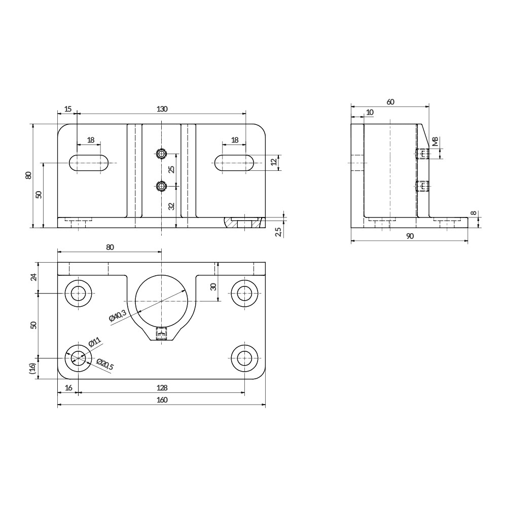 Base de fixação vertical para união em superfícies em Cantoneira de 90º. O tubo é fixado através da pressão dos parafusos prisioneiros. Não requer usinagem do tubo.