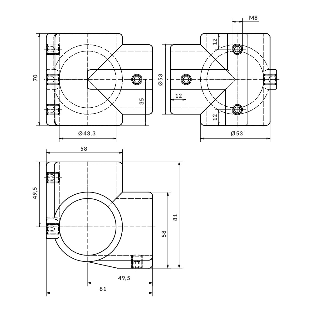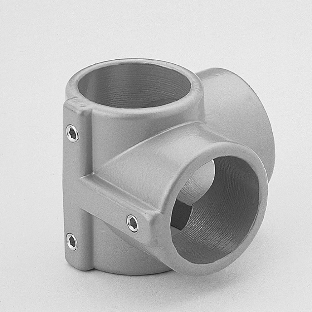 União para conectar um tubo passante a dois tubos a 90º. Fixam-se através da pressão exercida por parafusos prisioneiros. Não requer usinagem dos tubos.