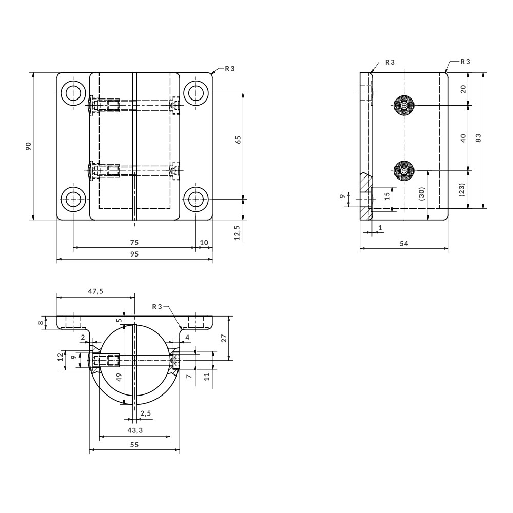 Base de fixação para suporte de um tubo passante numa superfície vertical. O tubo é unido através da pressão das duas partes do União. É necessário perfurar o tubo para a inserção dos parafusos. Proporciona uma união robusta.