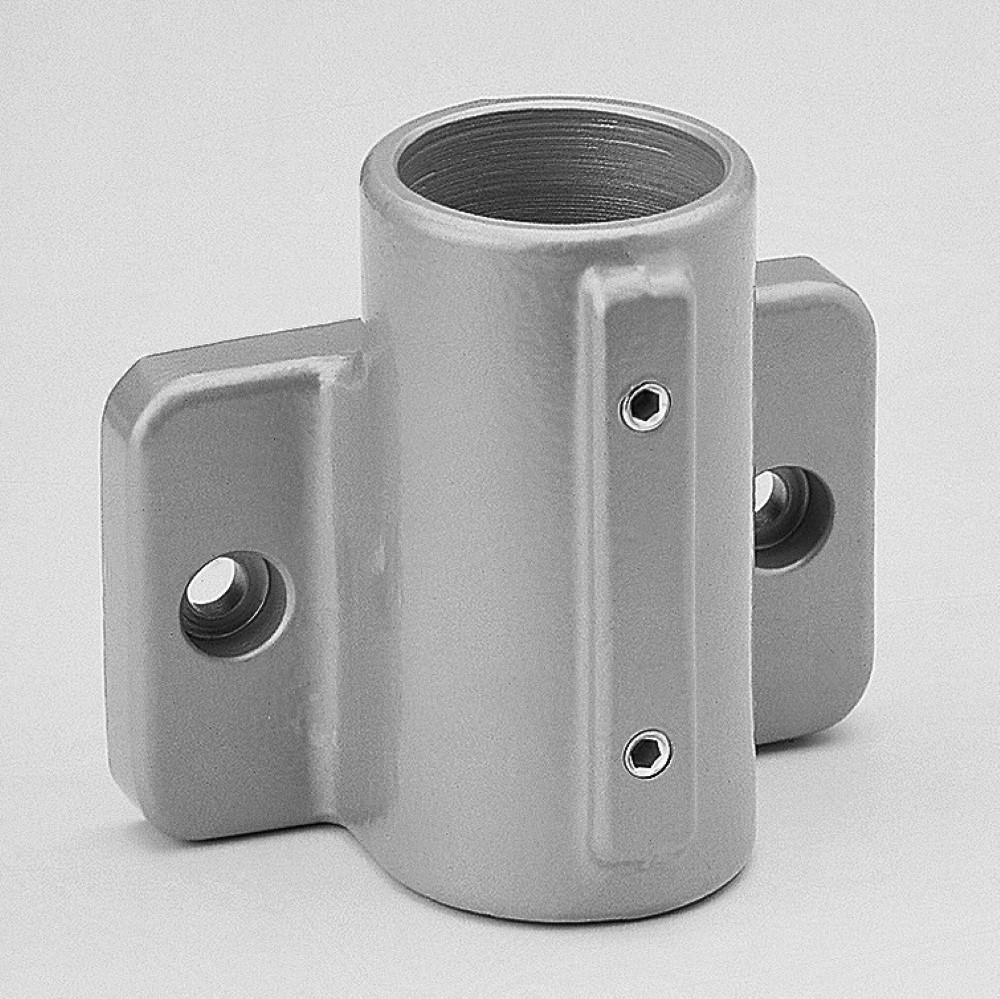Base de fixação para suporte de um tubo terminal numa superfície vertical. O tubo é fixado através da pressão exercida pelos parafusos prisioneiros. Não requer usinagem dos tubos.