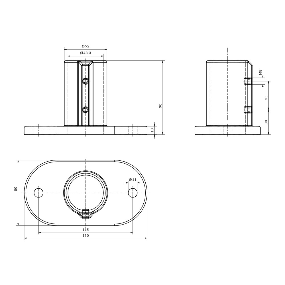 Base de fixação para fixação do tubo à superfície, com 2 pontos de fixação. O tubo é fixado através da pressão exercida pelos parafusos prisioneiros. Não requer usinagem dos tubos.