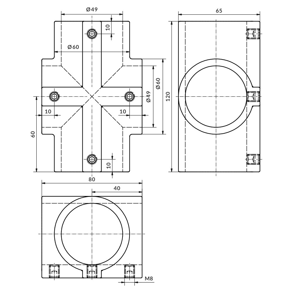 União para conectar um tubo passante a outros dois tubos terminais a 90º. São fixados através da pressão exercida por parafusos prisioneiros. Não requer usinagem dos tubos.