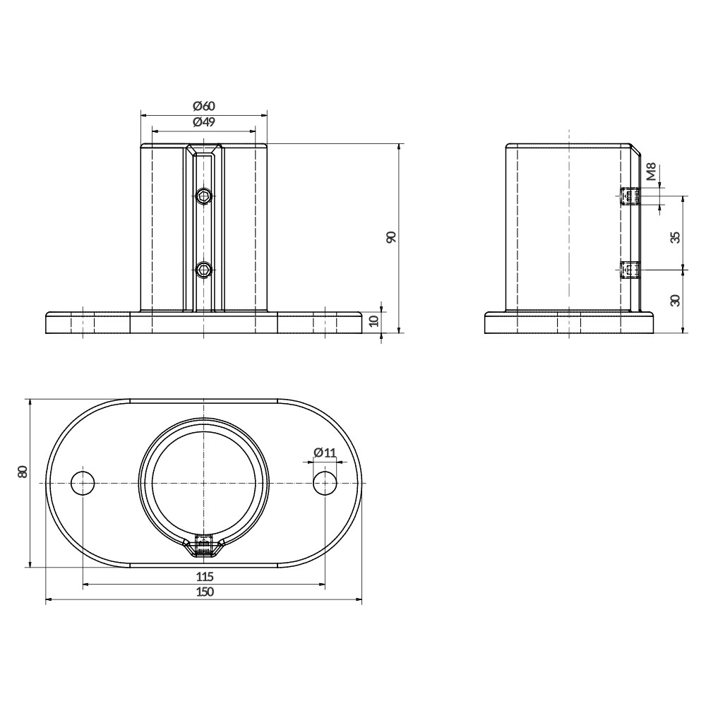 Base de fixação para fixação do tubo à superfície, com 2 pontos de fixação. O tubo é fixado através da pressão exercida pelos parafusos prisioneiros. Não requer usinagem dos tubos.