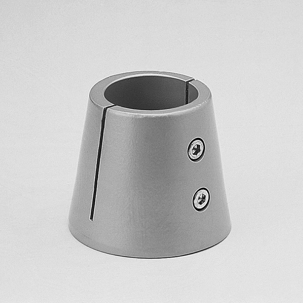Base de fixação vertical cónica. O tubo é unido através da pressão das duas partes do União. É necessário perfurar a extremidade dos tubos para a inserção dos parafusos. Proporciona uma união robusta.